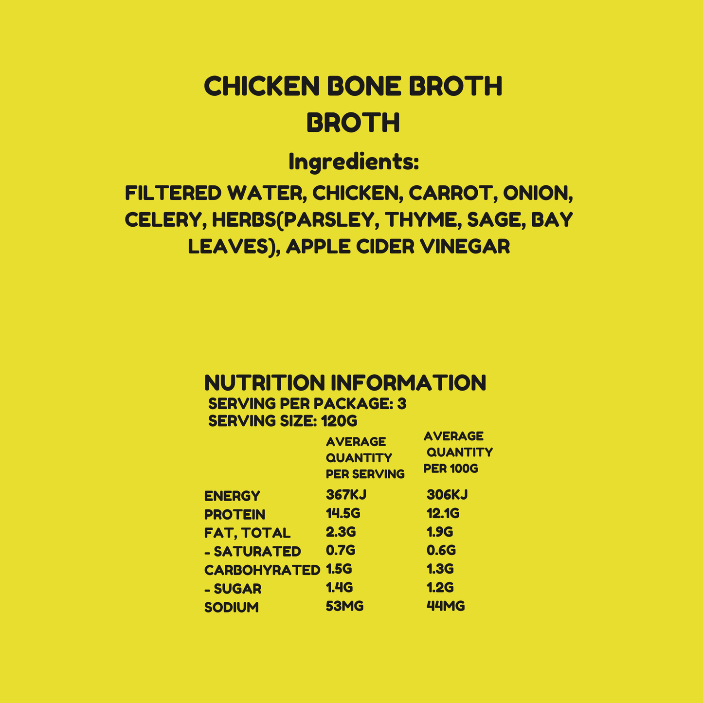 - High-Quality Ingredients: Made with filtered water, chicken, carrot, onion, celery, fresh herbs (parsley, thyme, sage, bay leaves), and apple cider vinegar. No sugar, salt, preservatives, or fillers—just wholesome goodness.